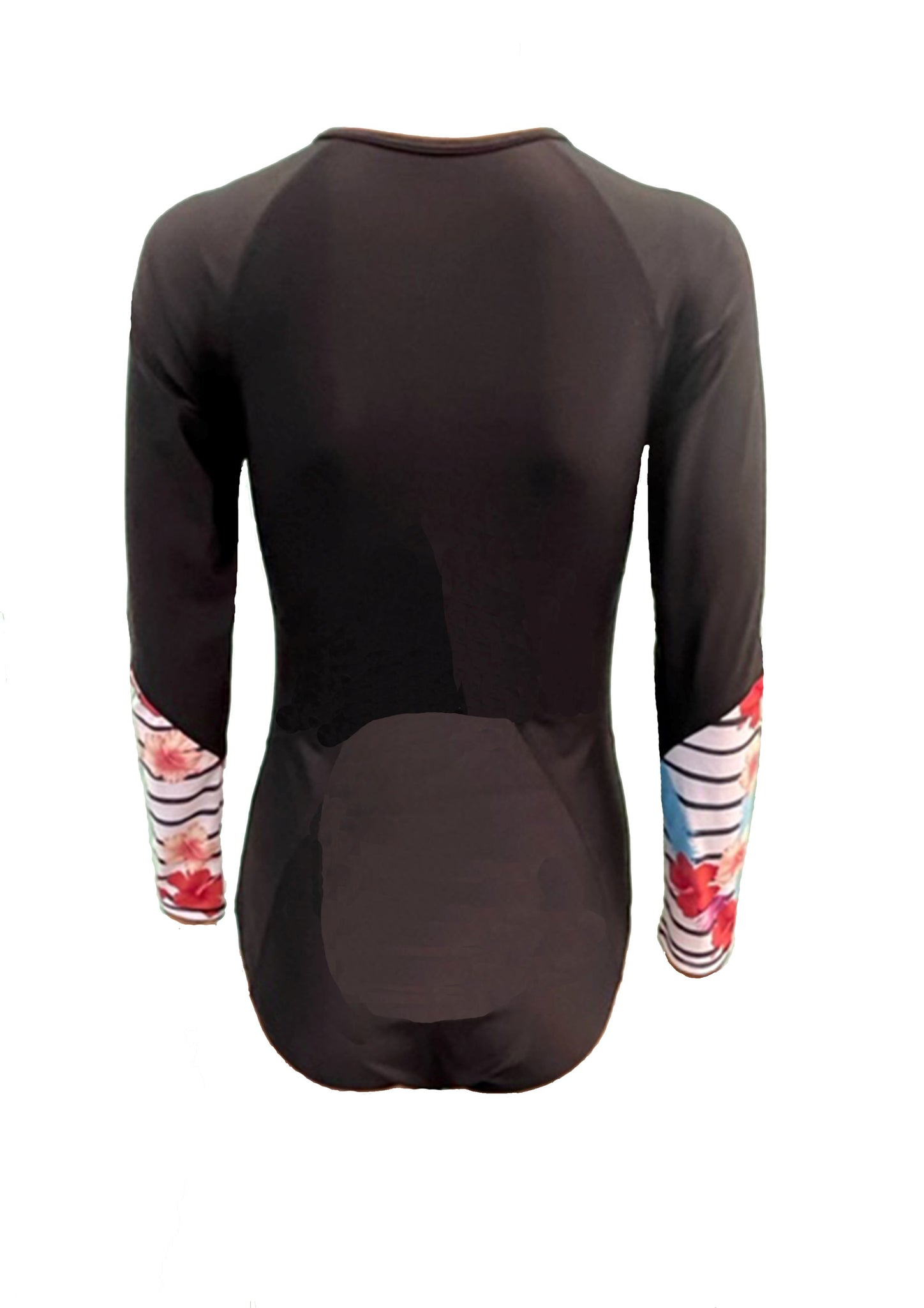 Hibiscus and Feather has UV50+ sun protection. It is designed and sewn with panel sewing methods to give you a slimmer silhouette. The dark color side panel helps further give a slimming effect. In addition, the bust area has a hibiscus and feathers print with horizontal stripes to show a fuller bust. The swimsuit has a long front zipper with protective cloth behind. It is comfortable and fashionable. The swimsuit has Ultra Violet Protection factor of 50+. It has long sleeves and a full bottom.