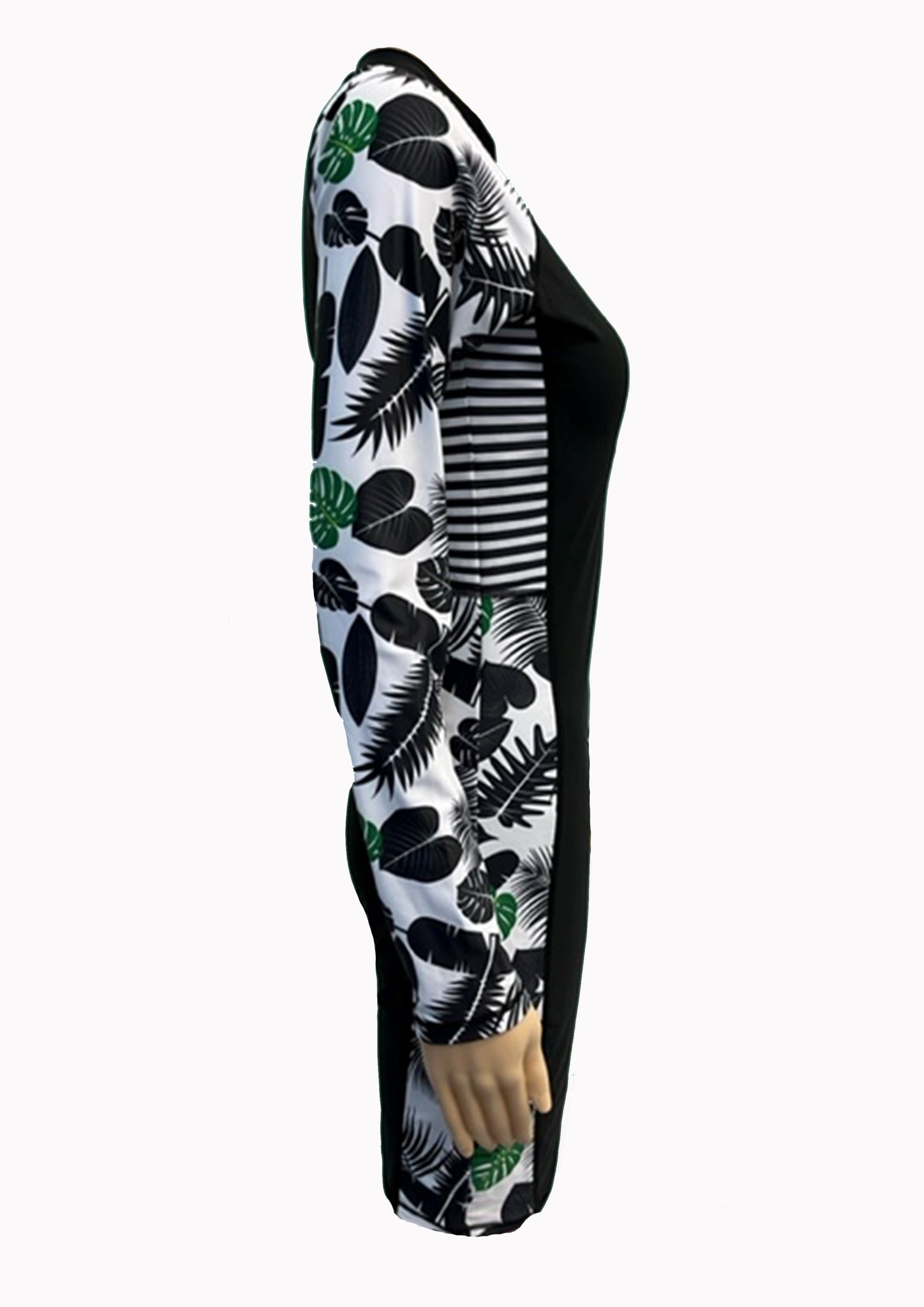 Black and White theme one piece swimsuit has UV50+ sun protection. It is designed and sewn with panel sewing methods to give you a slimmer silhouette. The black side panel helps further give a slimming effect. Thin lines also helps with the slimming effect. The swimsuit has a long front zipper with protective cloth. There is also sewn in paddings. It is comfortable and fashionable. The long sleeves and long shorts will also help with sun protection.